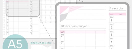 10年後のゴールから逆算して、週予定に落とし込める計画表です。A4コピー用紙に横向きに印刷して、折りたたんで左側に穴を開けて使います。A5のバインダーまたはシステム手帳でご活用ください。 リフィル情報 種類 その他 サイ … 続きを読む [2026年1月始まり・4月始まり]10年計画表:A5